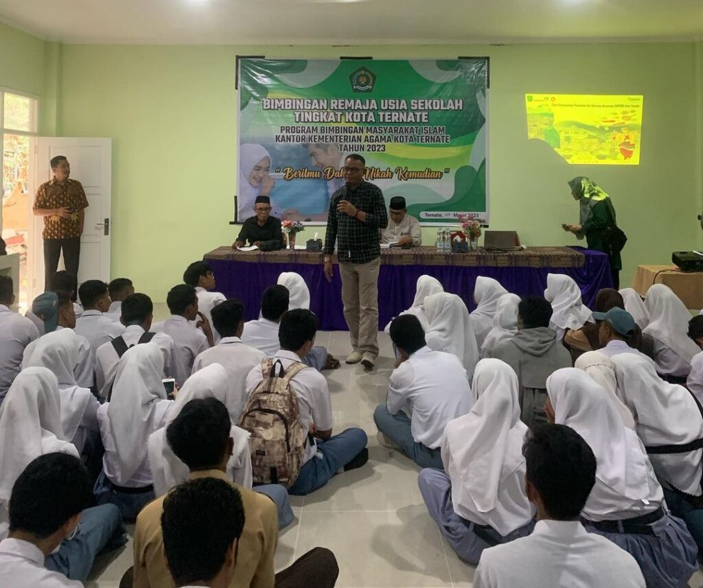 Kegiatan pembinaan yang mengusung tema “Berilmu Dahulu, Nikah Kemudian”, Kepala Kantor Kementerian Agama Kota Ternate, Amir Tomagola hadir sebagai narasumber menyampaikan materi tentang dampak dan resiko dari pernikahan dini.