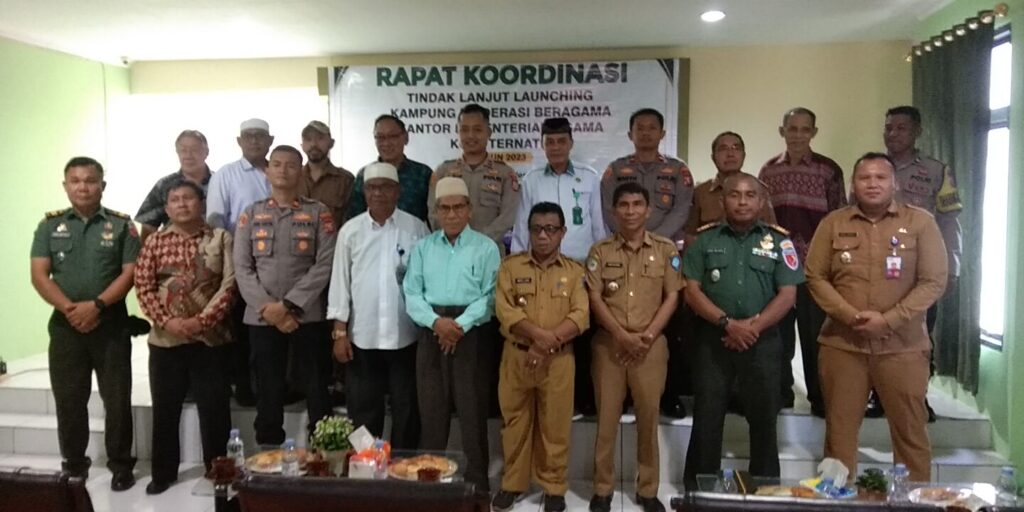 Ternate,- Kepala Kantor Kementerian Agama Kota Ternate, H. Amir Tomagola didampingi Kasubbag Tata Usaha, H. Maskur Sapsuha dan Kepala Seksi Bimas Islam, H. Lukman Hatari bersama jajaran melaksanakan Rapat Koordinasi Tindak Lanjut Launching Kampung Moderasi Beragama dengan stakeholder terkait, pada Selasa (24/10/2023).