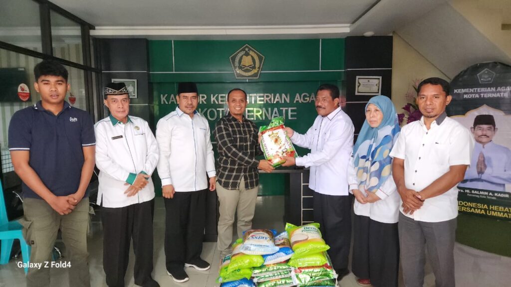 Penyerahan bantuan oleh Kepala Kantor Kementerian Agama Kota Ternate didampingi oleh Kasi Bimas Islam, Kasi Pendidikan Agama dan Keagamaan Islam, Kasi Pendidikan Madrasah dan Penyelenggara Zakat Wakaf.