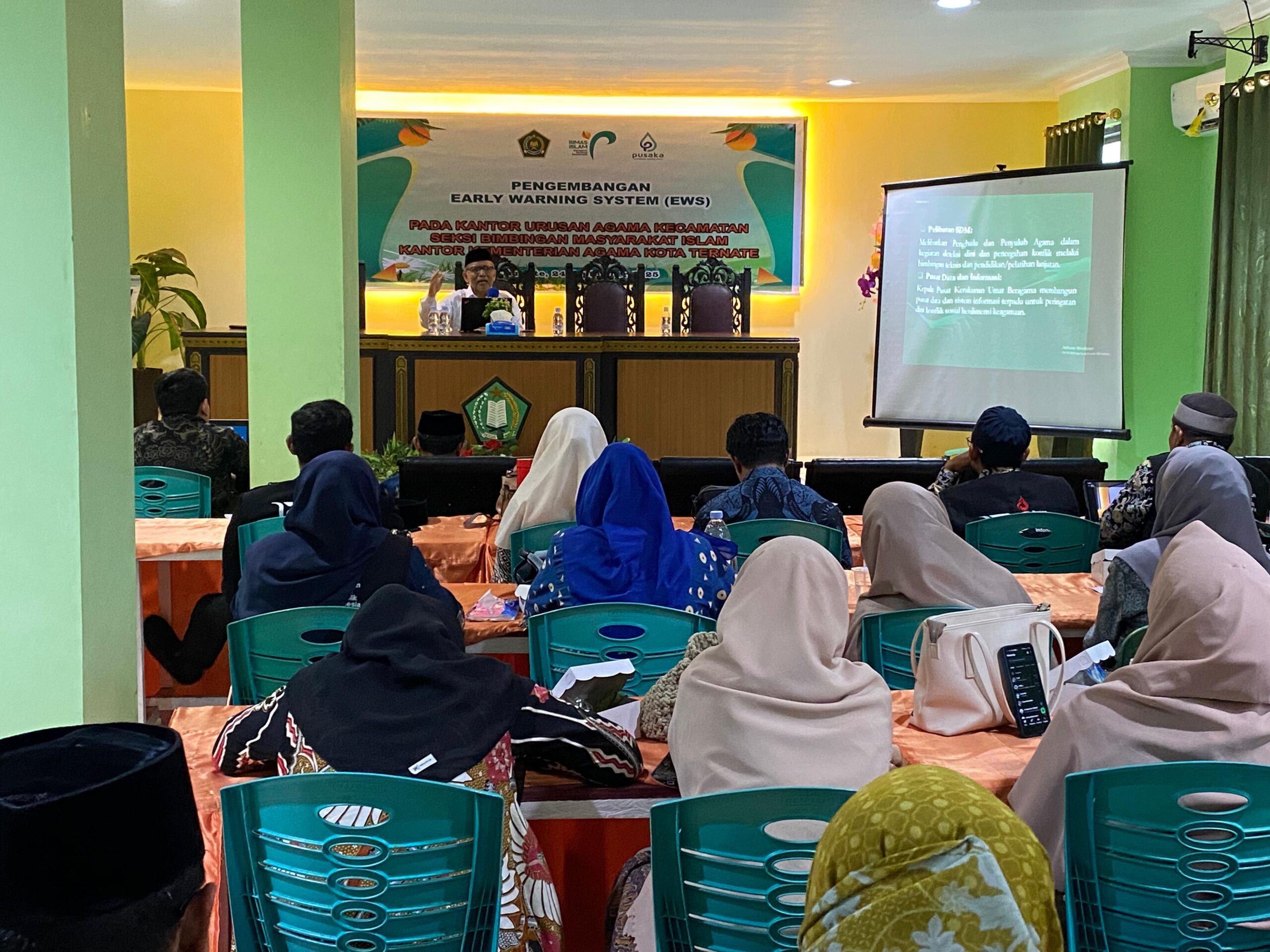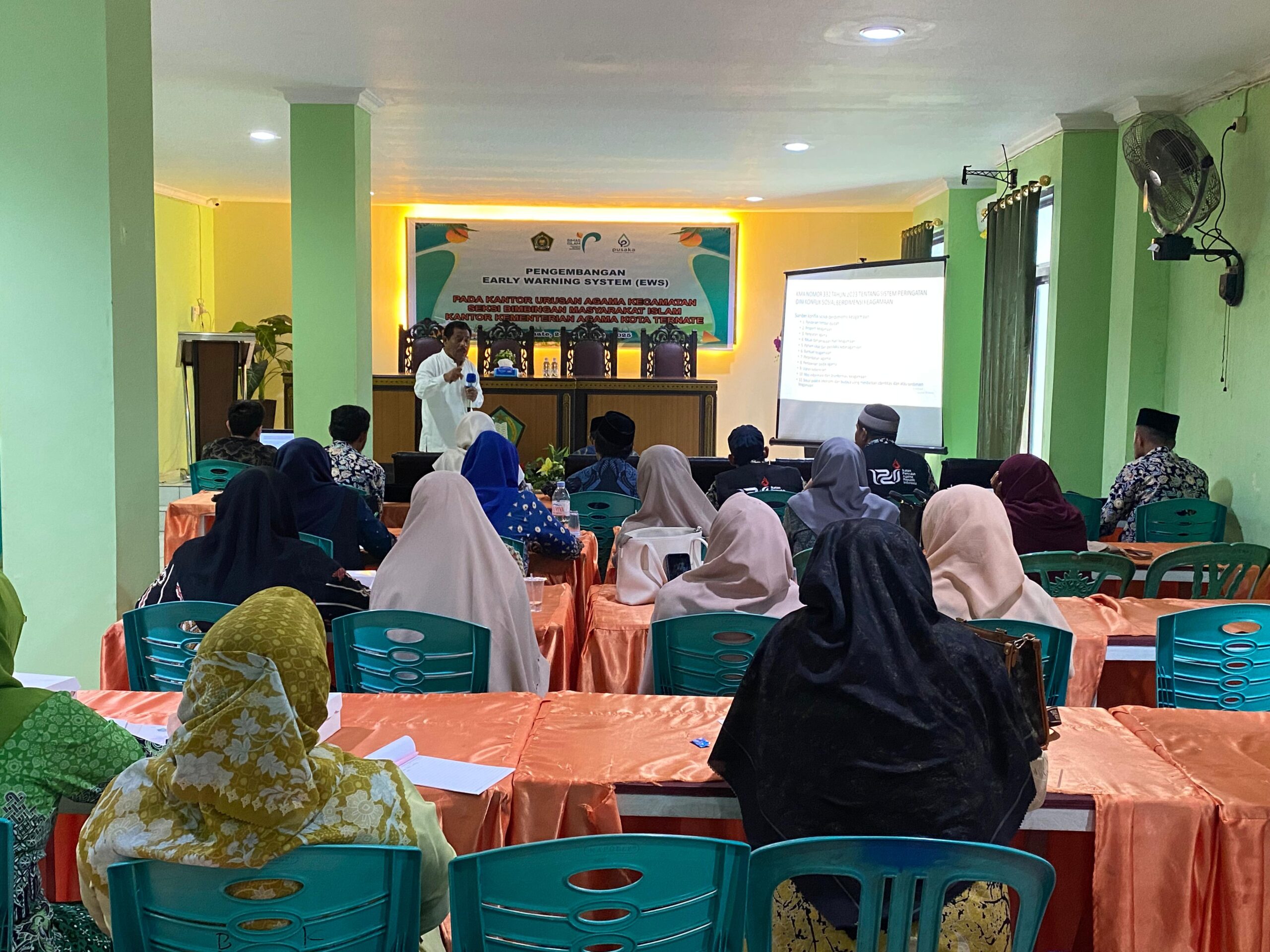 Kegiatan yang dimulai pukul 08.00 hingga 12.00 WIT ini diikuti oleh para Kepala Kantor Urusan Agama (KUA), Penghulu, serta Penyuluh Agama Islam baik PNS dan non-PNS maupun PPPK yang bertugas di KUA Kecamatan se-Kota Ternate sebanyak 26 orang peserta. Kegiatan ini bertujuan menjadikan Penghulu dan Penyuluh Agama Islam dapat melaksanakan tugasnya dalam memberikan penerangan dan pencerahan kepada masyarakat binaannya terkait dengan mengembangkan Early Warning System, juga menjadikan para Penghulu dan Penyuluh Agama Islam berperilaku disiplin dalam melaksanakan etos kerja dan tugas-tugasnya sesuai dengan program kerja Penyuluh Agama Islam. Serta, menjadikan Penghulu dan Penyuluh Agama Islam yang memiliki strategi untuk mengajak dan membimbing masyarakat agar dapat hidup rukun bertoleransi dalam bersikap menghargai perbedaan keyakinan.