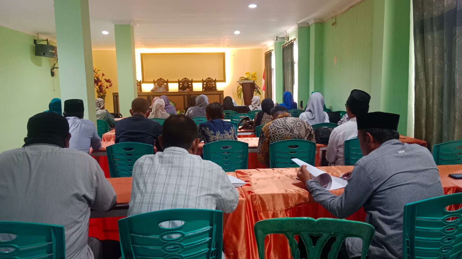 Ternate,- Kamis (19/02/2026) Bertempat di Aula Nurhasanah Kantor Kementerian Agama Kota Ternate, diselenggarakan kegiatan sosialisasi teknis pelaksanaan Ujian Madrasah yang dirangkaikan dengan pembahasan persiapan Tes Kompetensi Akademik (TKA). Kegiatan ini dihadiri oleh Kepala Seksi Pendidikan Madrasah (Penmad) Kantor Kementerian Agama Kota Ternate, Sahdi Muhammad Laher, Ketua Pokjawas, para pengawas madrasah, para Kepala Madrasah tingkat MA, MTs, dan MI, serta admin EMIS Kemenag Kota Ternate.